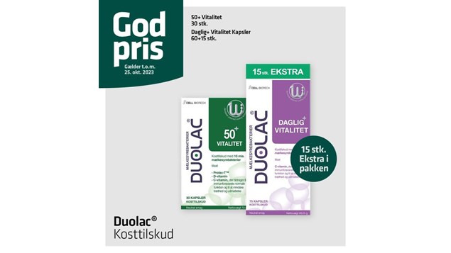 Duolac kosttilskud til en ekstra fordelagtig pris!! 💜 Duolac Daglig + Vitalitet Kapsler 60+15stk. er mælkesyrebakterier tilsat C-vitamin, der ligeledes bidrager til immunforsvarets normale funktion...