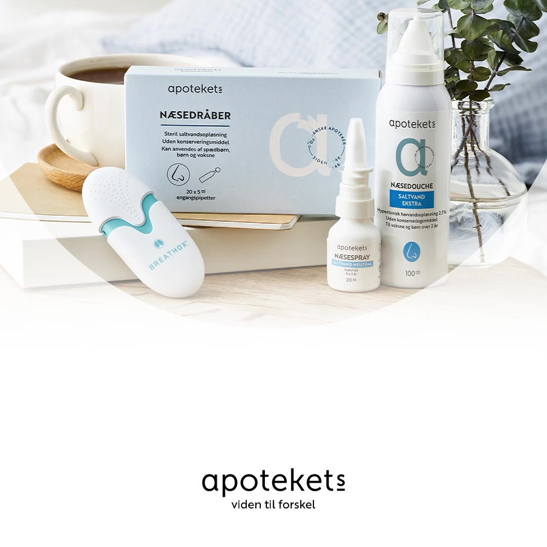 På apoteket finder du både næsespray, næsedråber og næsedouche med neutralt saltvand - selvfølgelig uden konserveringsmidler!