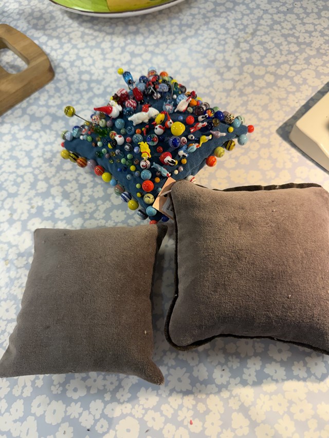 Anzhelika fra Ukraine er i arbejdsforløb i genbrugsbutikken gennem jobcentret. Lige nu er hun i gang med at sy fine nålepuder, som snart kan købes i butikken.